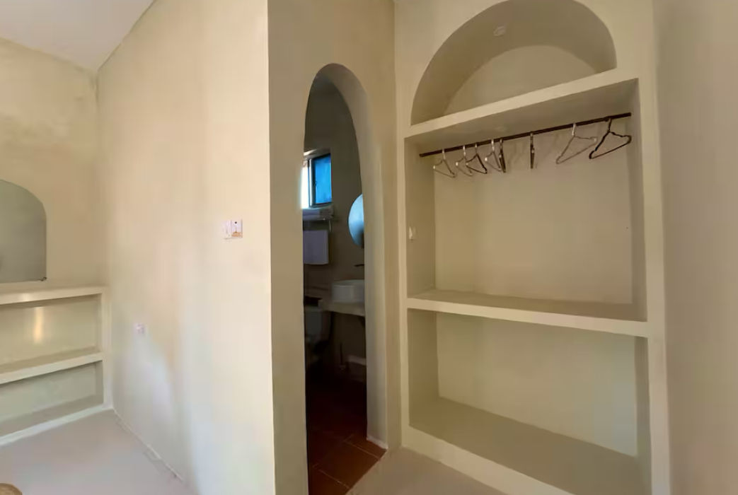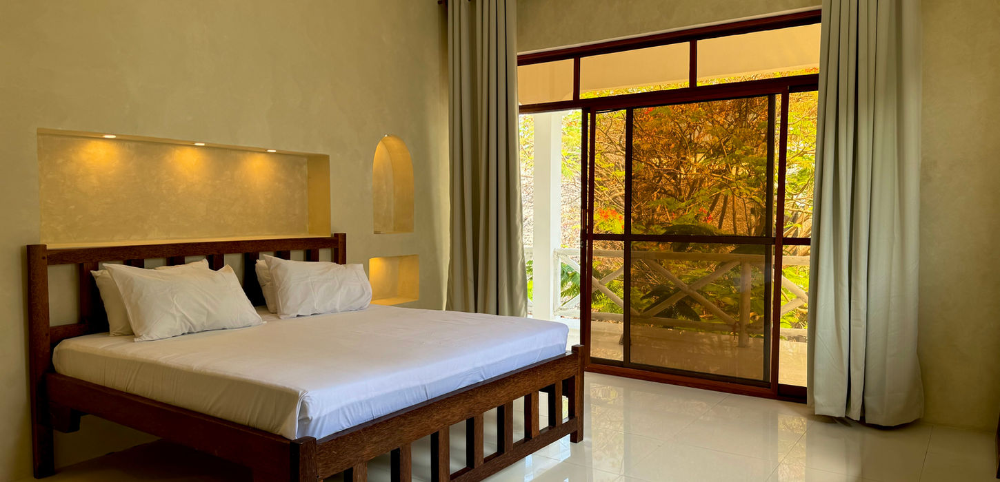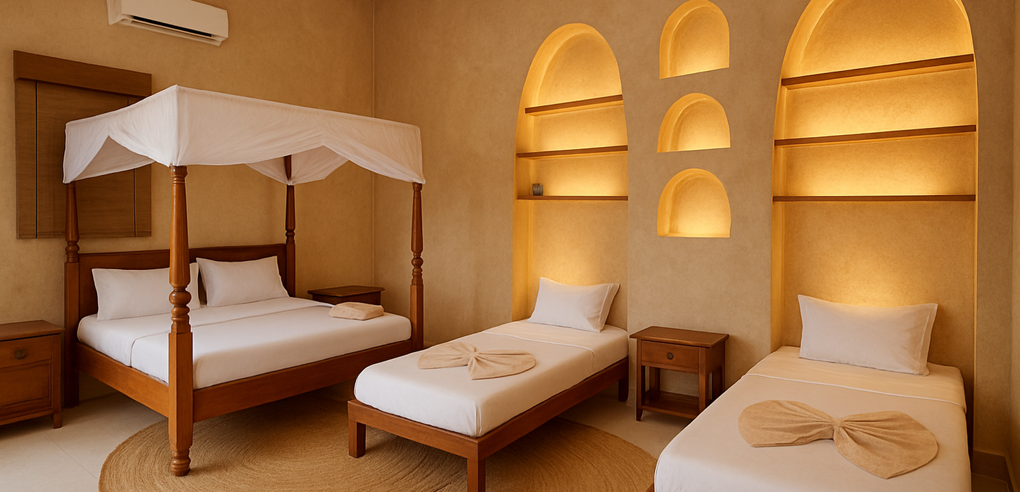 Enjoy a relaxing stay in our comfortable family room just steps from the beach. Designed in a light, coastal style, the room features locally handmade furniture that adds warmth and character. It includes a king-size bed, a twin-size sofa bed ideal for children, and a TV for unwinding after a day in the sun. A modern bathroom with a walk-in shower provides added comfort, and a delicious breakfast is included to start your day by the sea.
